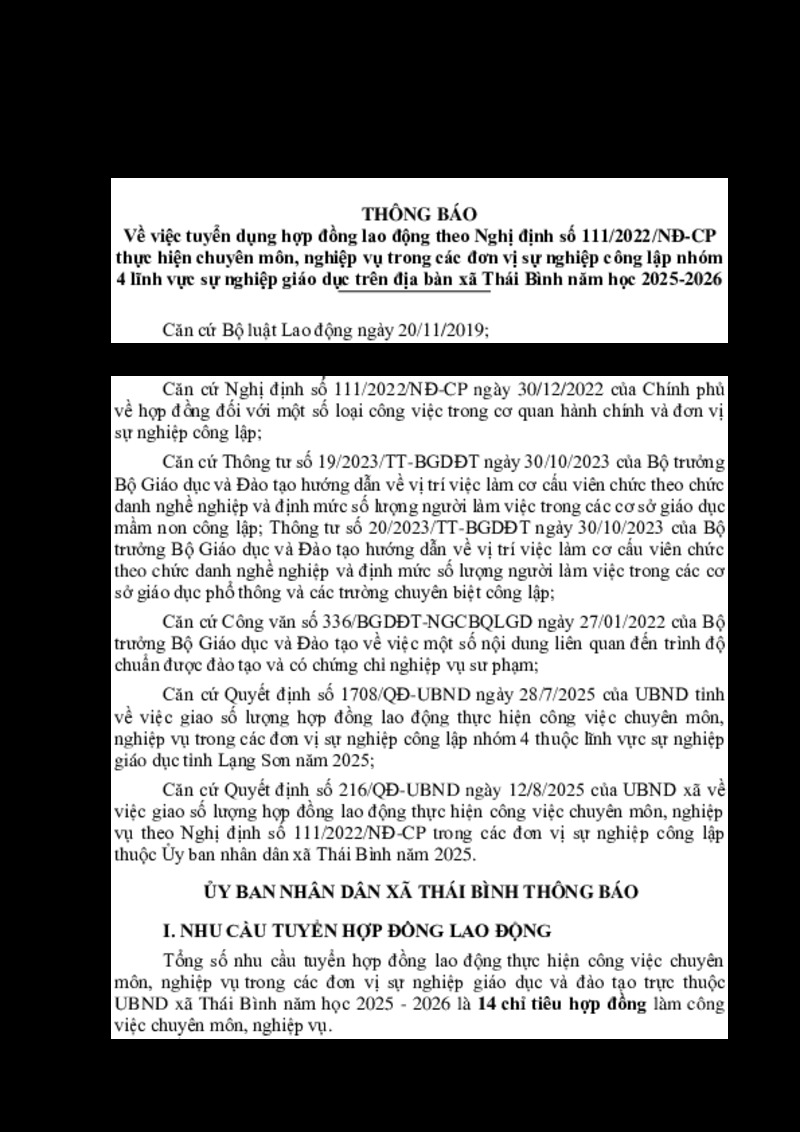 | Tiêu đề văn bản | Về việc tuyển dụng hợp đồng lao động theo Nghị định số 111/2022/NĐ-CP thực hiện chuyên môn, nghiệp vụ trong các đơn vị sự nghiệp công lập nhóm 4 lĩnh vực sự nghiệp giáo dục trên địa bàn xã Thái Bình năm học 2025-2026 | ||