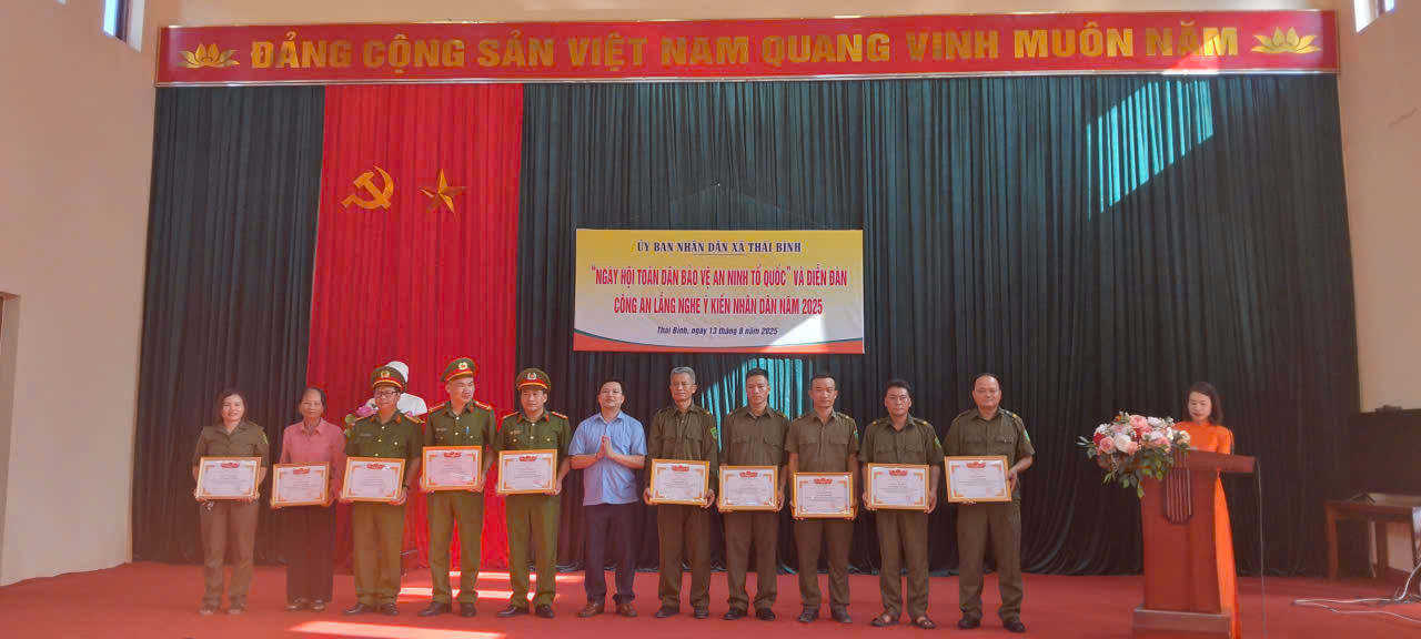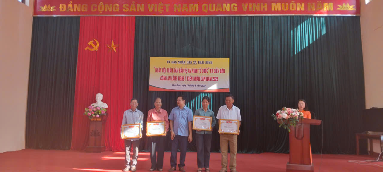 Tại ngày hội Chủ tịch UBND xã trao tặng giấy khen cho 04 tập thể, 10 cá nhân có thành tích trong phong trào toàn dân bảo vệ ANTQ; 01 tập thể, 04 cá nhân có thành tích đột xuất trong công tác đấu tranh phòng, chống tội phạm. Đại diện Chi nhánh VNPT, Viettel trên địa bàn thưởng nóng tổng số tiền là 10.000.000đ về thành tích đột xuất trong công tác phối hợp, bắt giữ 01 vụ = 01 đối tượng Cướp tài sản (tài sản của Chi nhánh VNPT, Viettel tại Trạm BTS thuộc thôn Hoà An, xã Thái Bình)