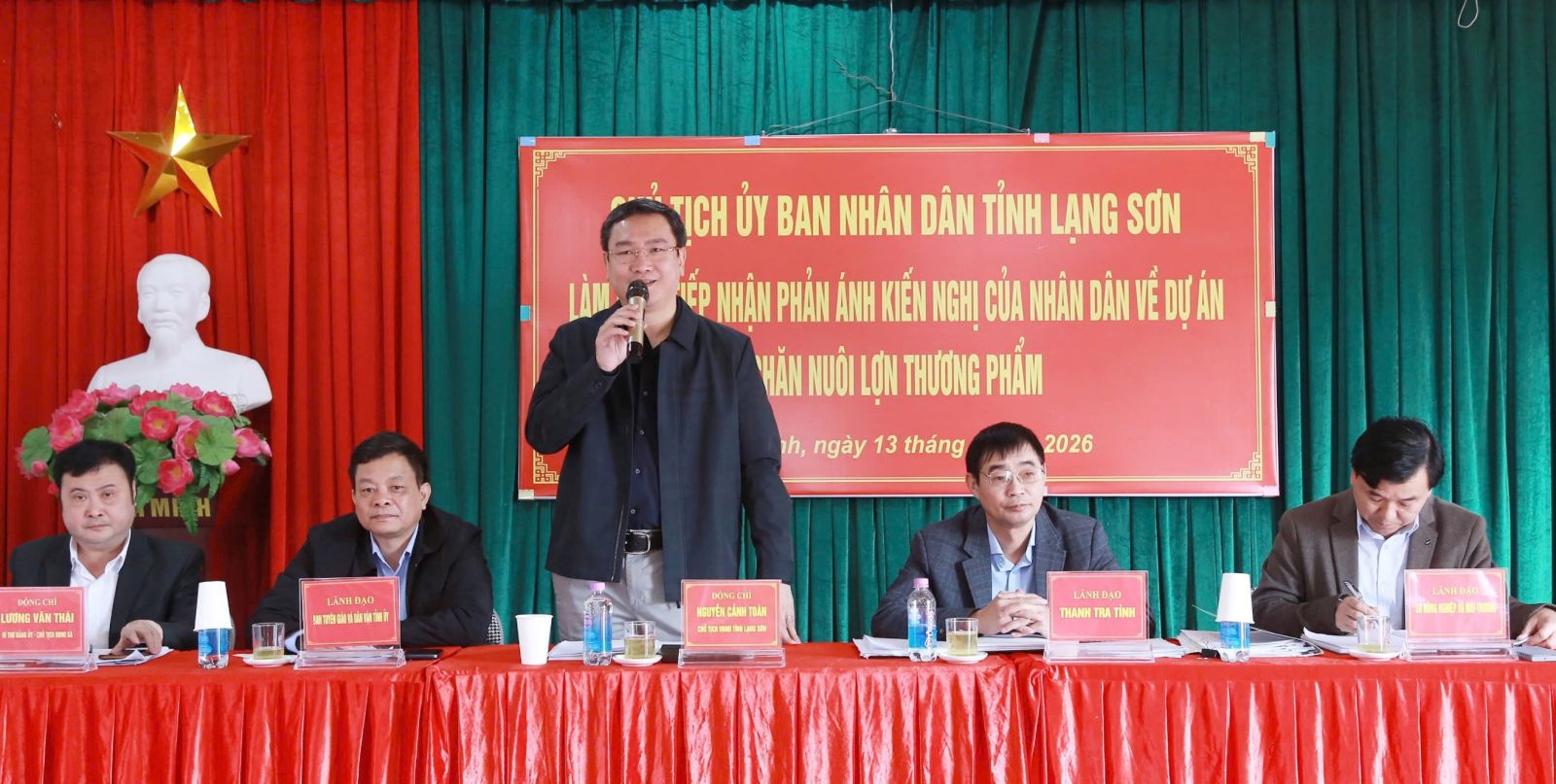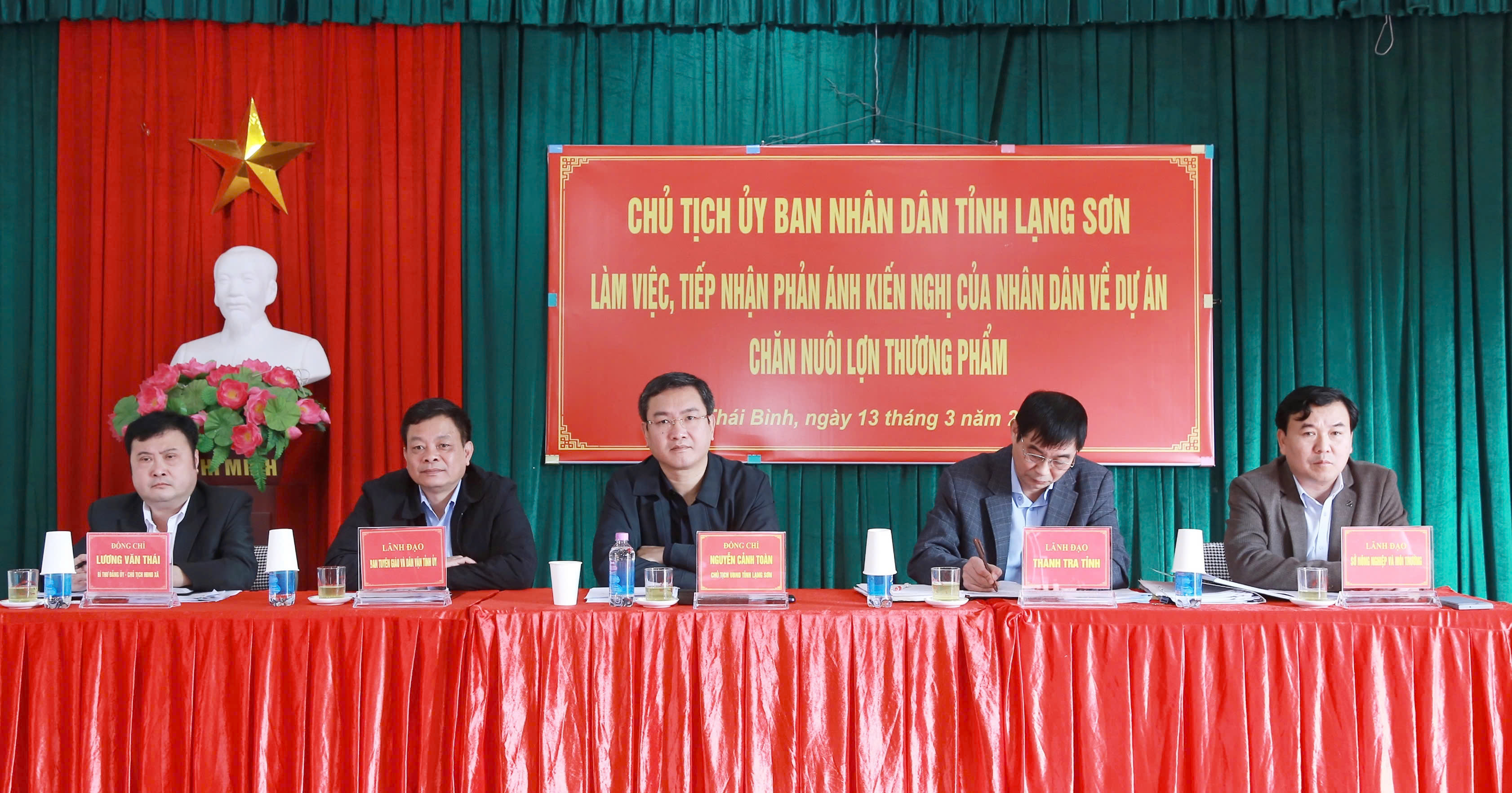 Sáng ngày 13/3, tại nhà văn hoá thôn Bình Giang, xã Thái Bình, đồng chí Nguyễn Cảnh Toàn, Phó Bí thư Tỉnh ủy, Chủ tịch UBND tỉnh làm việc, tiếp nhận các kiến nghị, phản ánh của công dân liên quan đến việc thực hiện Dự án trang trại chăn nuôi lợn thương phẩm của Công ty cổ phần chăn nuôi Rutech.