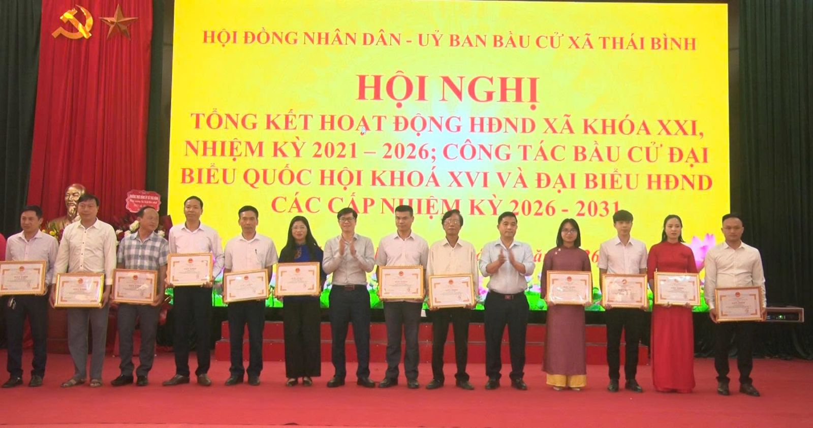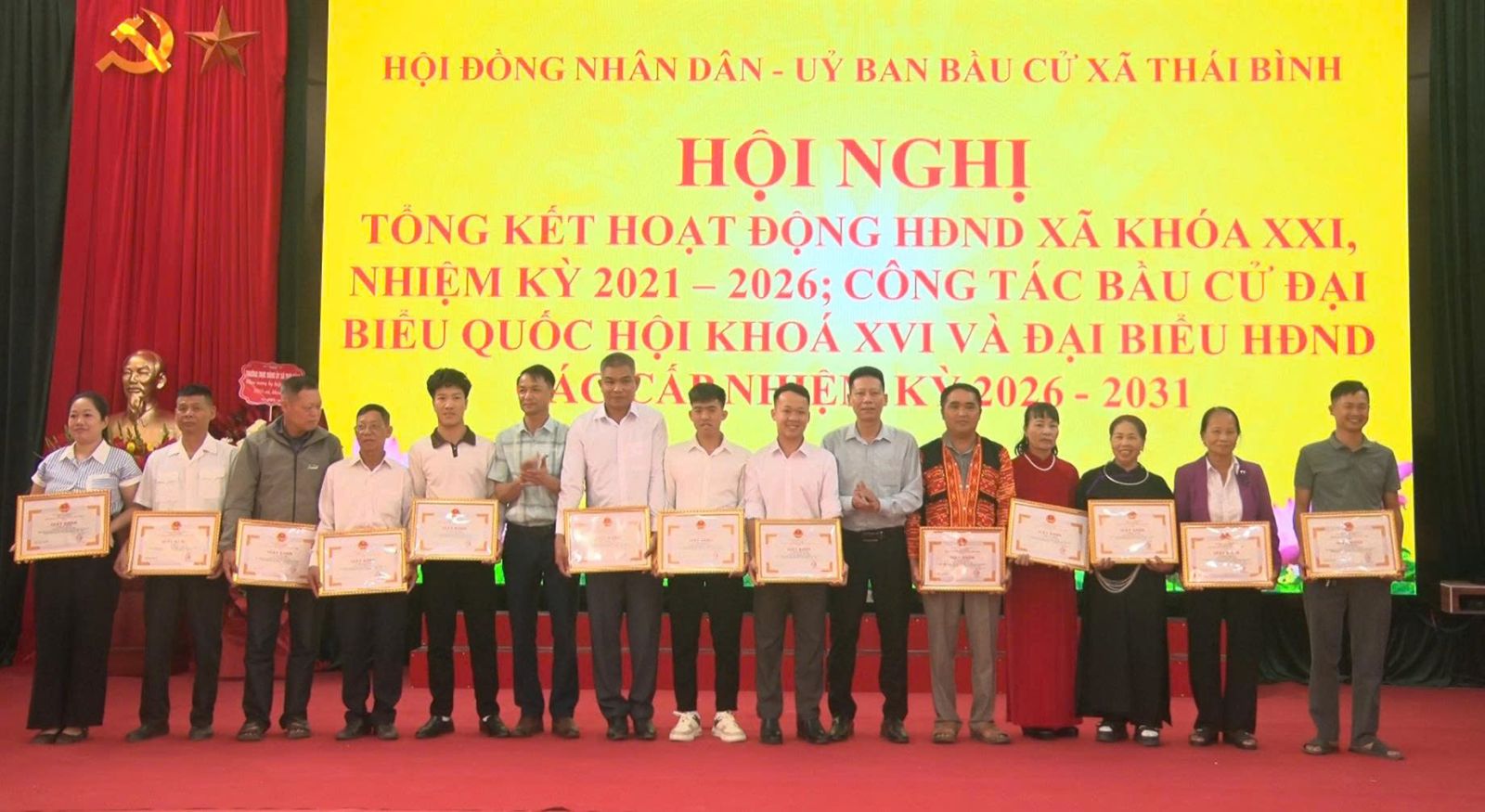 Nhân dịp này, Ủy ban nhân dân xã Thái Bình đã tặng Giấy khen cho các tập thể và cá nhân có thành tích xuất sắc trong công tác HĐND nhiệm kỳ qua và có đóng góp tích cực trong việc tổ chức, phục vụ cuộc bầu cử đại biểu Quốc hội khóa XVI và đại biểu HĐND các cấp nhiệm kỳ 2026 – 2031, đồng thời khen thưởng các tập thể, cá nhân có thành tích xuất sắc trong đợt cao điểm tấn công trấn áp tội phạm, đảm bảo an ninh trật tự dịp Tết Nguyên đán Bính Ngọ năm 2026.