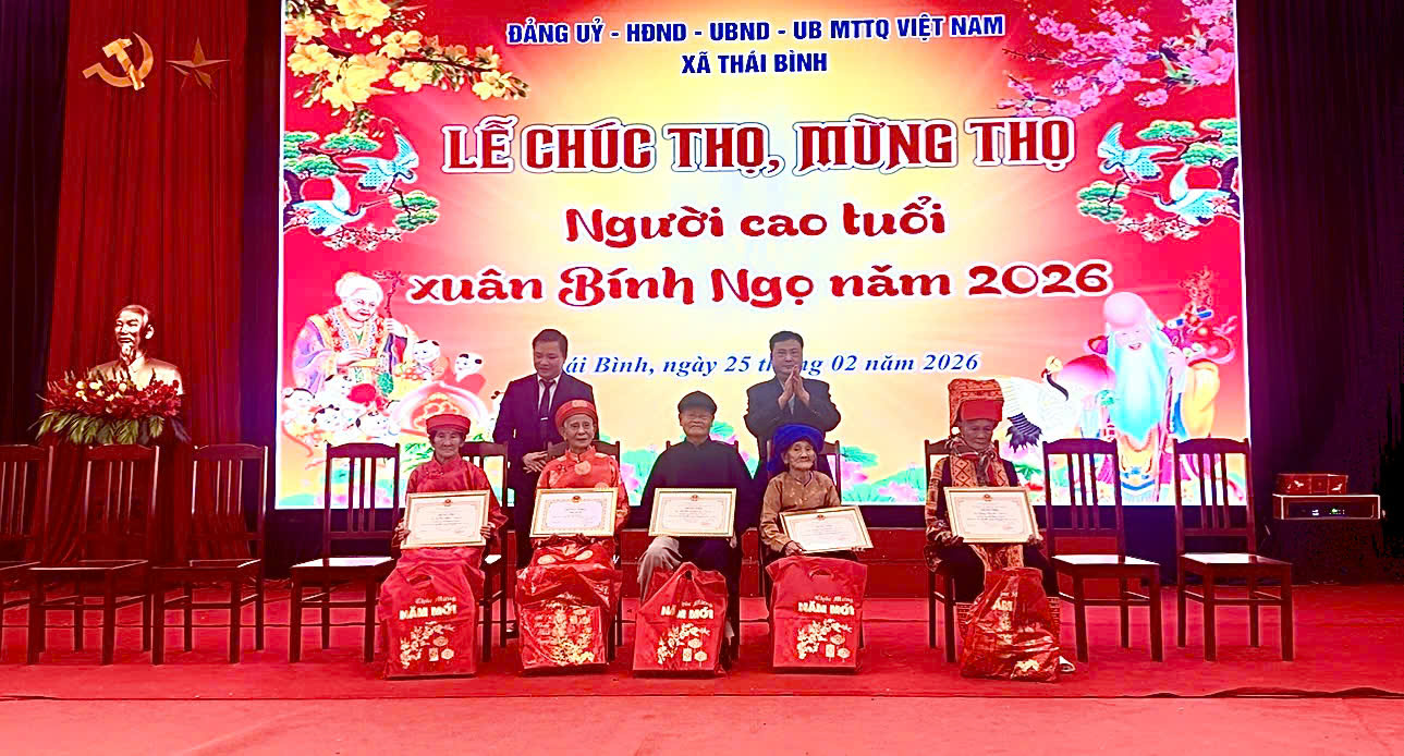 Năm 2026, xã Thái Bình có 85 cụ được tổ chức mừng thọ ở các mốc tuổi 70, 75, 80, 85, 90, 95. Trong đó, đặc biệt có 1 cụ thượng thọ tuổi 95, 7 cụ thượng thọ 90 tuổi. Tại buổi lễ, các đồng chí lãnh đạo xã đã ân cần thăm hỏi tình hình sức khỏe, đời sống của các cụ, đồng thời trao tặng Bằng mừng thọ và các phần quà ý nghĩa dành cho các cụ.