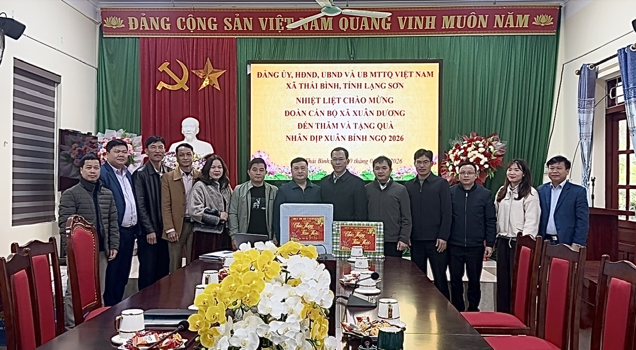 Ngày 10/02/2026, Đoàn công tác của xã Xuân Dương, tỉnh Lạng Sơn do đồng chí Lành Kim Quang, Phó Bí thư Thường trực Đảng ủy làm trưởng đoàn đã có buổi thăm, làm việc tại xã Thái Bình nhân dịp tết Nguyên Đán Bính Ngọ năm 2026. Làm việc với Đoàn có đồng chí Lương Văn Thái, Bí thư Đảng ủy, Chủ tịch HĐND xã; các đồng chí Lãnh đạo Thường trực Đảng ủy, HĐND, UBND, Ủy ban MTTQ Việt Nam xã Thái Bình; Lãnh đạo các phòng, ban chuyên môn xã Thái Bình.