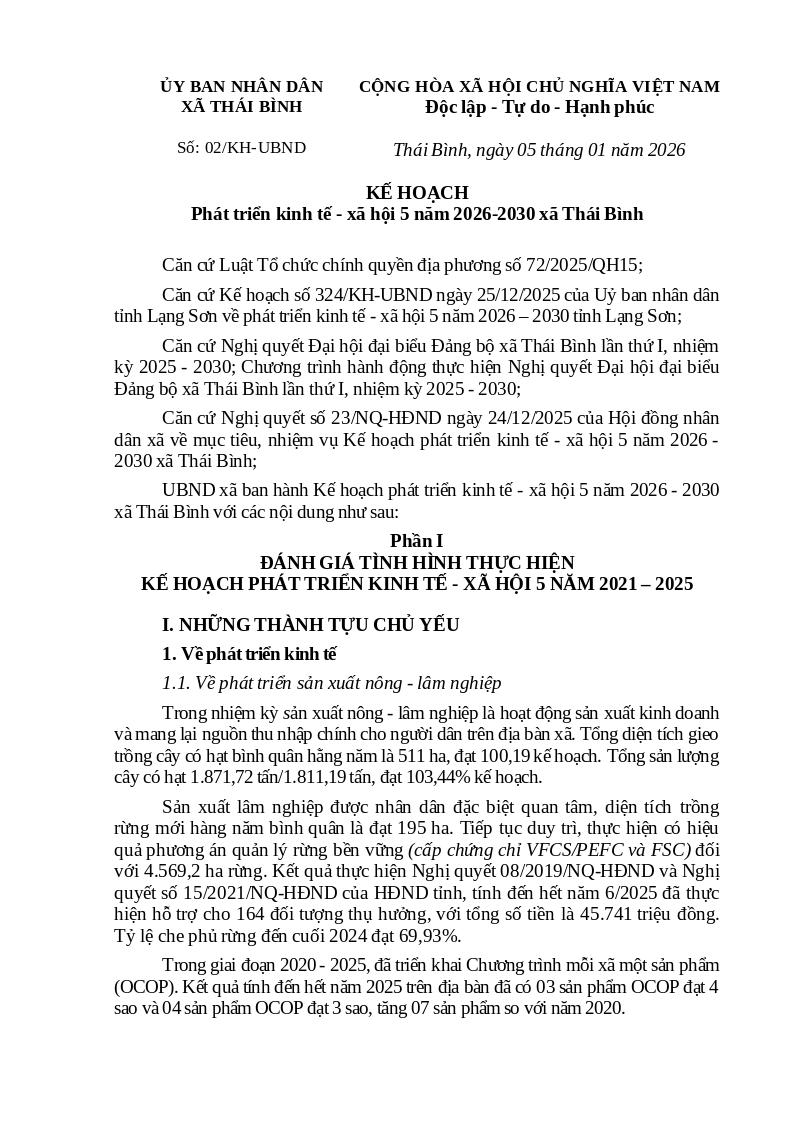 | Tiêu đề văn bản | Kế hoạch phát triển kinh tế - xã hội 5 năm 2026-2030 xã Thái Bình | ||