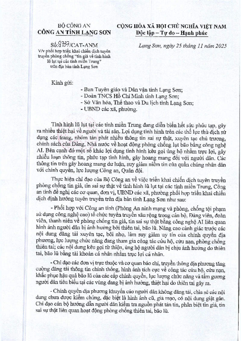 | Tiêu đề văn bản | Tuyên truyền phối hợp triển khai chiến dịch phòng chống "Tin giả về tình hình lũ lụt tại các tỉnh miền Trung" trên địa bàn tỉnh Lạng Sơn | ||