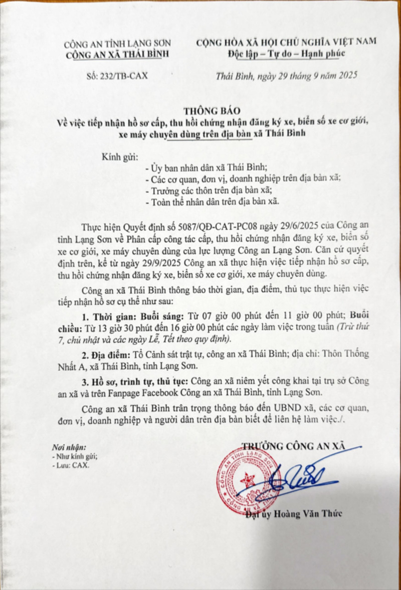 | Tiêu đề văn bản | Về việc tiếp nhận hồ sơ cấp,thu hồi chứng nhận đăng ký xe, biển xe cơ giới, xe máy chuyên dùng trên đại bàn xã Thái Bình | ||